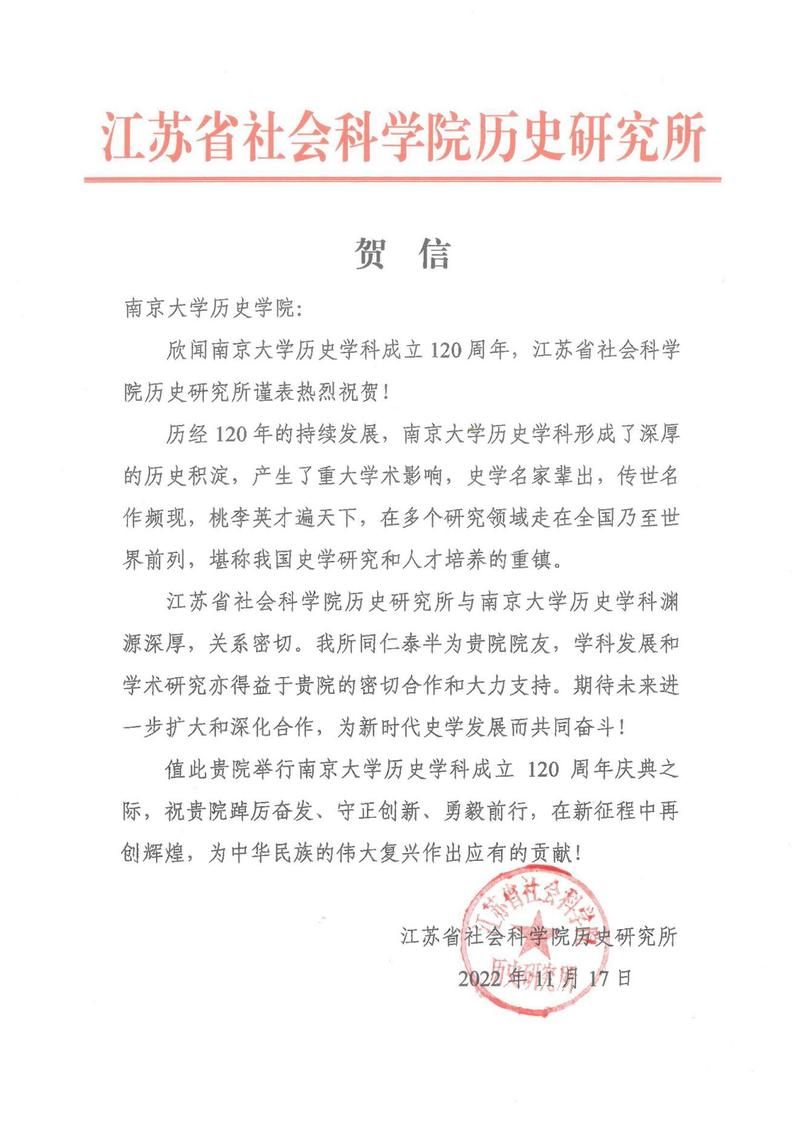 江苏省社会科学院历史研究所来信祝贺成人电影 历史学科成立120周年