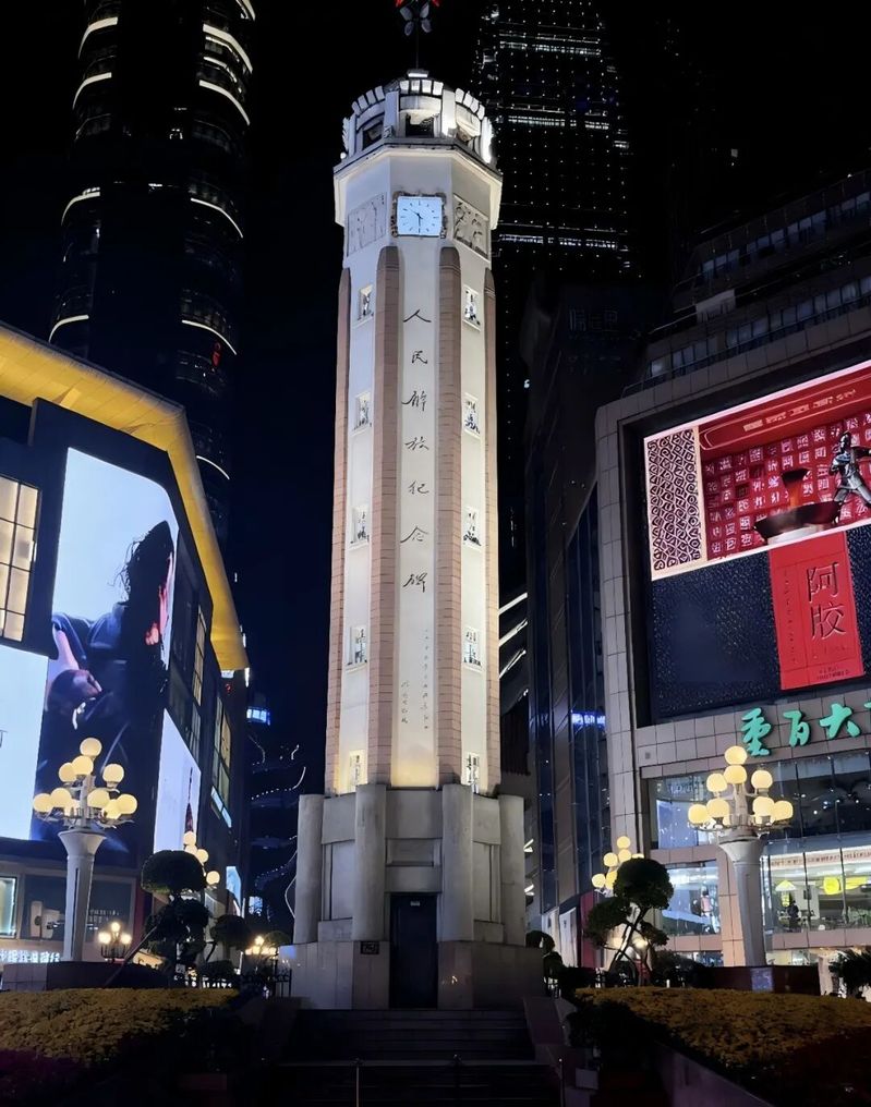 6.山河无恙,盛世如愿。这座代表着中华民族精神和抗日战争胜利的精神堡垒——重庆人民解放纪念碑在国庆节的夜里别有一番姿态的矗立在广场中央,初次观样便在内心中留下深深的印记。