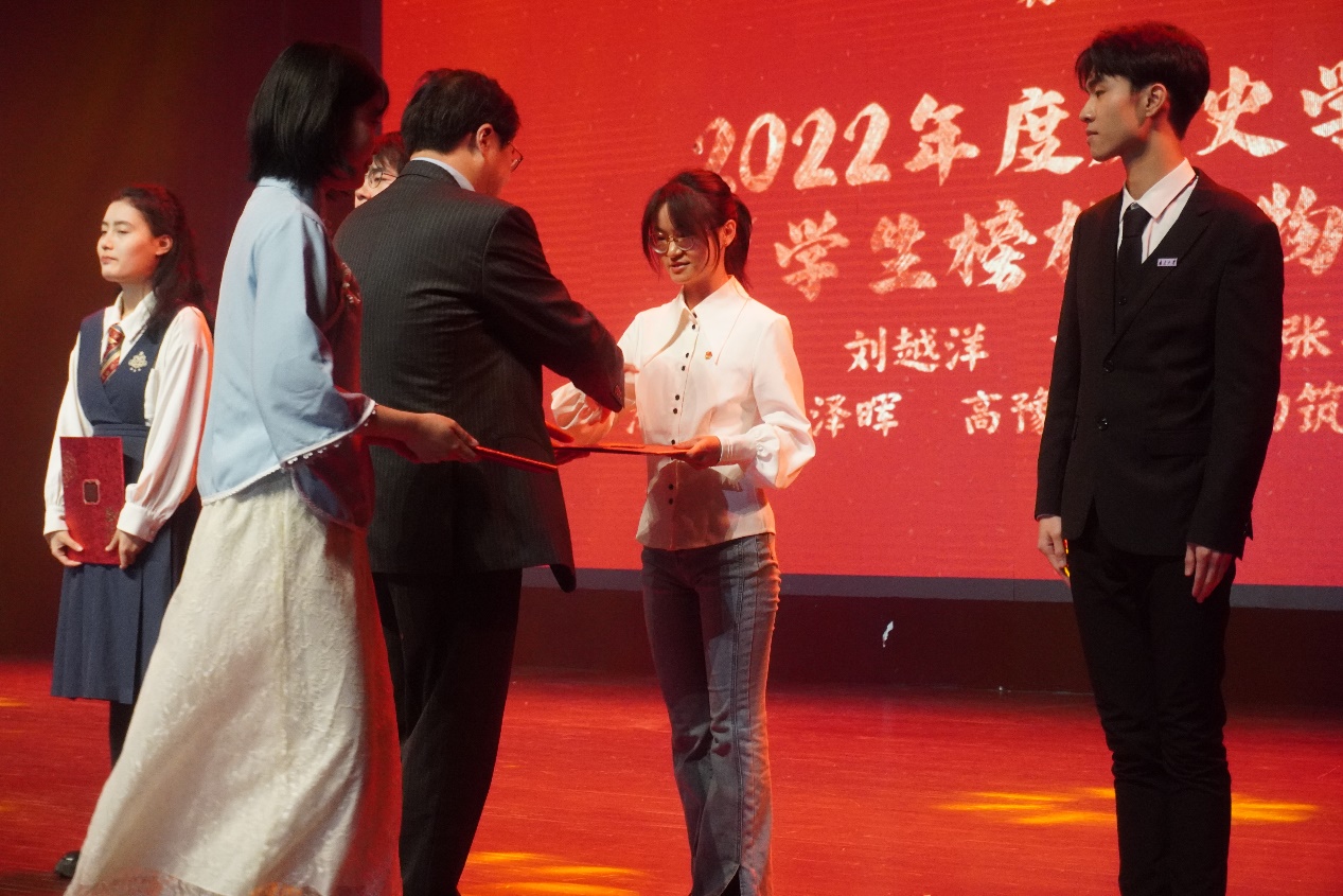 此次晚会上,成人电影 院长张生、党委书记赵清为代文泽、刘越洋、刘俊甫、张芊、秋香、冷婧、李泽晖、高豫来、彭韵筑、李书剑同学以及2012届校友、中国青年五四奖章获得者袁辉颁奖。他们踔厉奋发,积极参与社会实践与志愿服务,将个人理想与国家命运归流,为吾辈青年之榜样。
