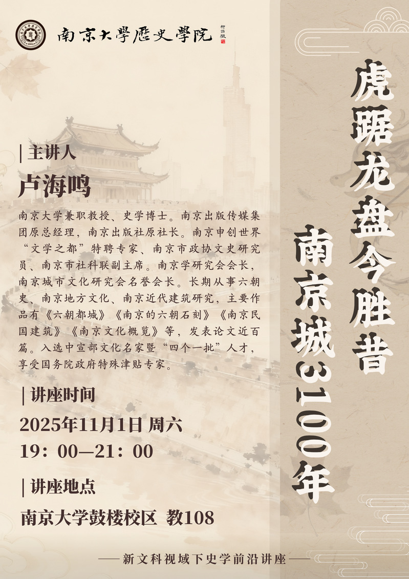 讲座预告丨新文科视域下史学前沿讲座:虎踞龙盘今胜昔,南京城3100年