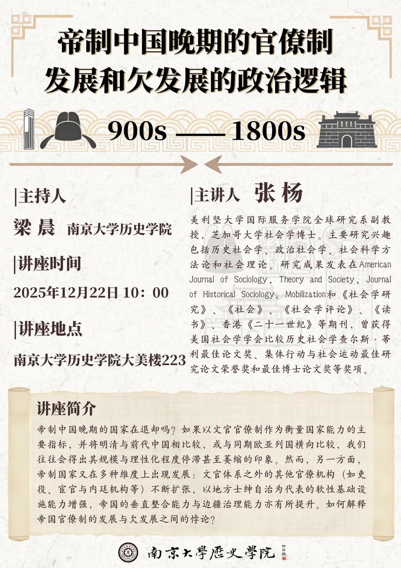 讲座预告丨帝制中国晚期的官僚制发展和欠发展的政治逻辑(900s-1800s)
