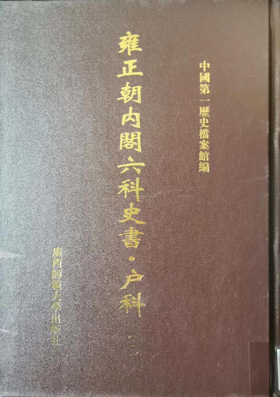 《雍正朝内阁六科史书·户科》为明清档案丛书之一,影印本,共105册,由中国第一历史档案馆编纂,2007年广西师范大学出版社出版 。