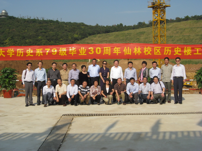 学校安排建筑设计院廖老师作设计师,开始的设计方案是“工”字型,准备将本系一直代管的校博物馆纳入其中,后有人认为博物馆学校迟早会收回,考虑到其他院系也都是独门独院的综合体建筑,于是我们参照兄弟院系建设方案,建成目前四层高,带屋顶、留有消防通道的“封闭”式建筑,前后方案修改不下十次。2013年正式动工,2014年底完工。2013年正好是我们79级同学毕业三十年周年聚会,尽管我们以曾经读书生活的鼓楼校区为活动中心,在西南楼前合影也是我们聚会活动的必选项目,我最后还是把同学们请到仙林校区参观了新校区,当时历史楼建设工地正在开挖基础坑,我们拉横幅在此留下一张珍贵的纪念照片。新建成的历史楼,建筑面积过万,楼下还有一个6000平米的人防工程,平时用作车库。就硬件而言,应该是亚洲最大的成人电影 了。
