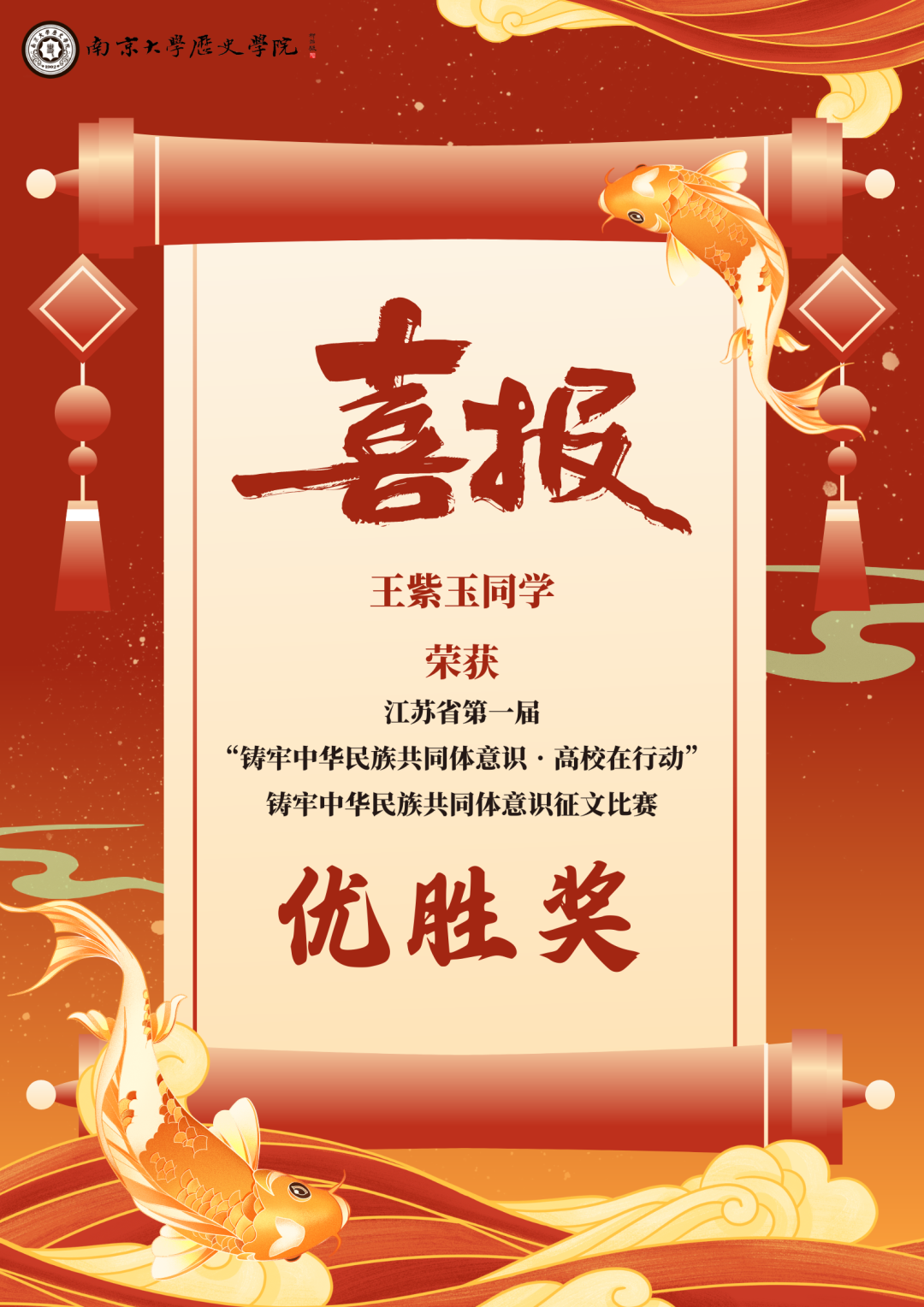热烈祝贺成人电影 王紫玉同学的文章《各族同胞共济同心 守护中华文明之源——新疆特克斯县考古文博事业考察》,在江苏省第一届“铸牢中华民族共同体意识·高校在行动”铸牢中华民族共同体意识征文比赛中,荣获优胜奖。