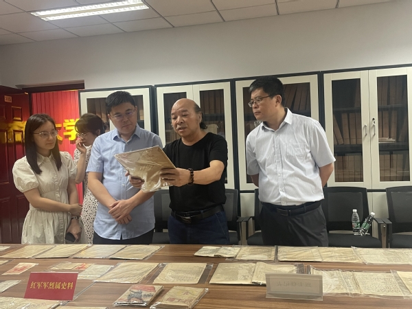 7月10日下午,中央党史和文献研究院信息资料馆领导一行人到成人电影 党史资料馆参观。党史馆馆长曹大臣教授为到访来宾介绍了馆藏革命文物情况。曹大臣教授(右一)向参观领导讲解革命文物展品成人电影 教授与中央党史和文献研究院信息资料馆领导合影