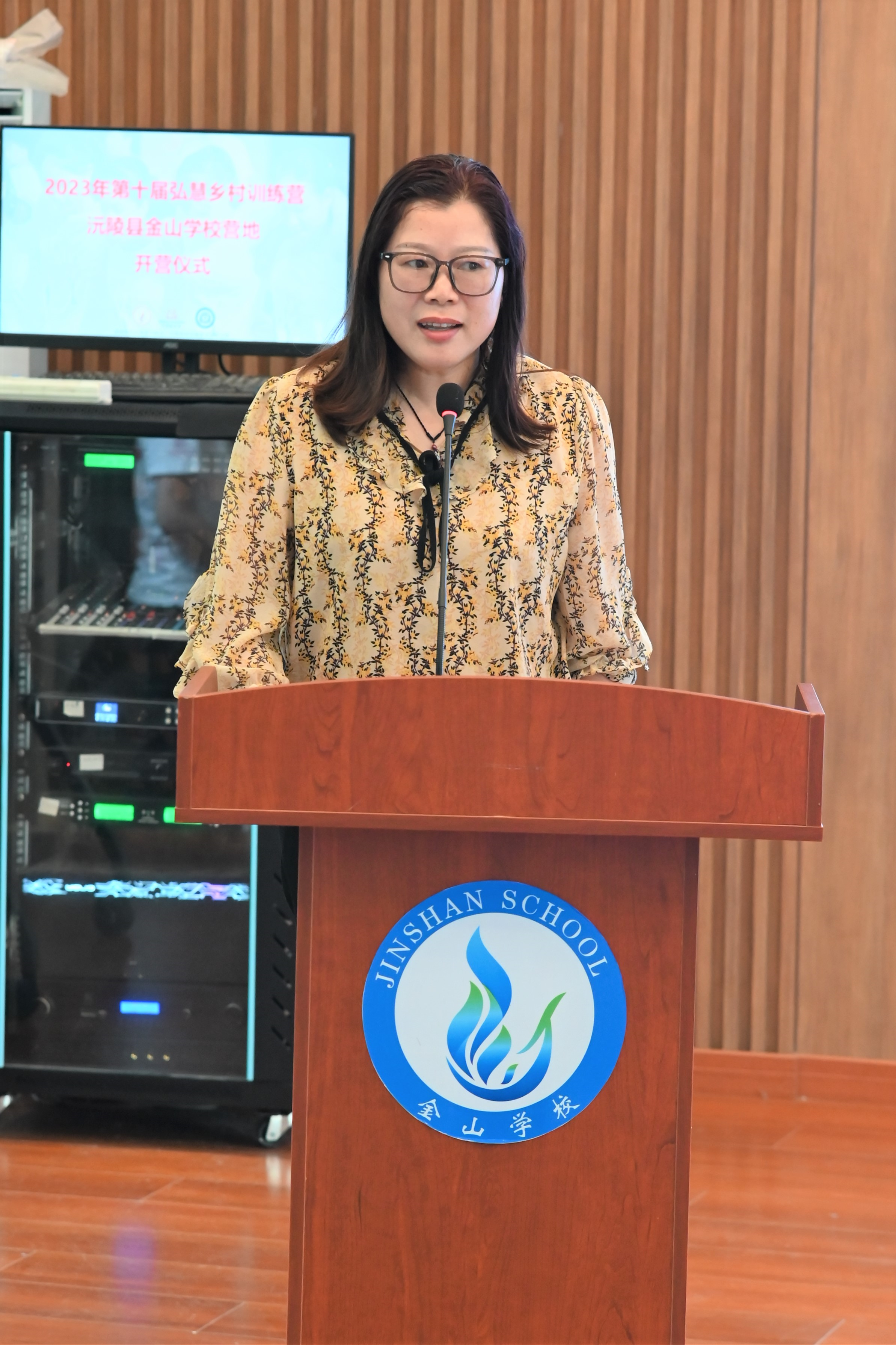 金山学校向明珠副校长为训练营的前期准备提供了细致的关切和鼎力的支持,她在致辞中表达了对于全体训练营营员的祝福与期待,她强调金山学子应互助友爱、尊敬师长、努力学习、快乐生活,也祝愿暑期训练营活动圆满成功。