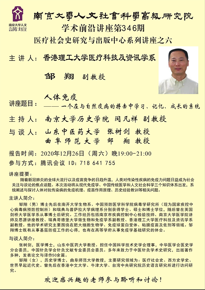讲座预告 | 人体免疫——一个在与自然疫病的搏击中学习、记忆、成长的系统