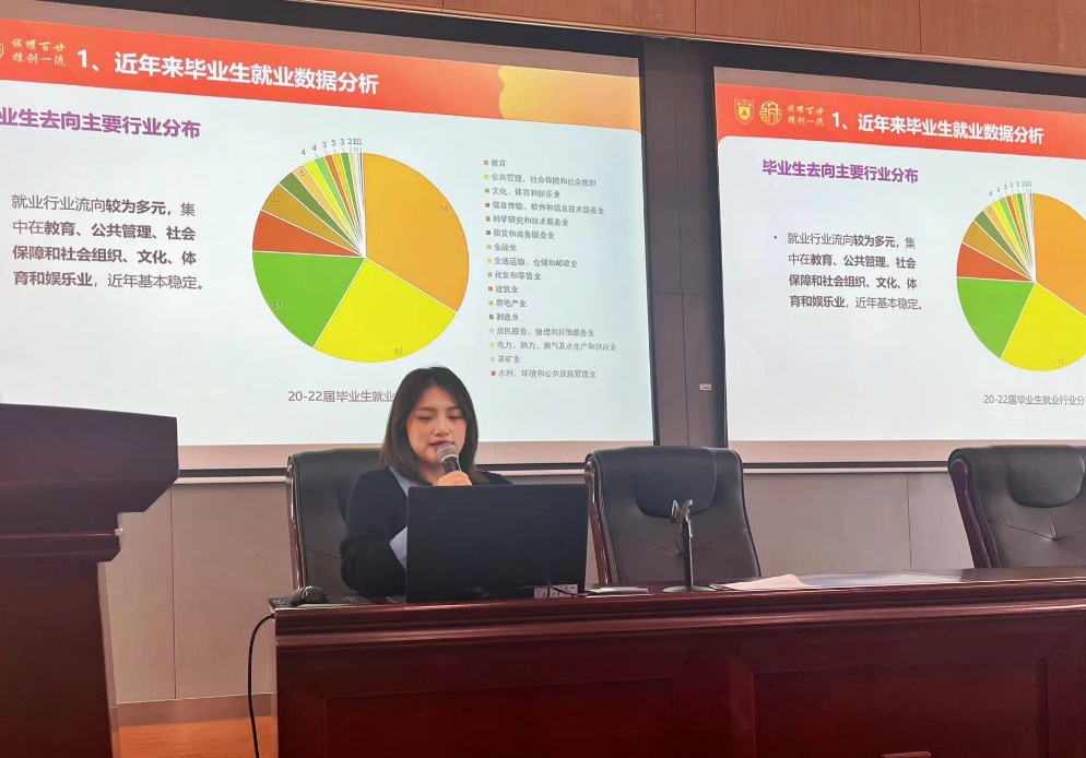 会议伊始,研究生辅导员王恩惠结合相关数据,简要地介绍了近三年来成人电影 硕士毕业生规模、就业情况以及毕业生的去向,按照专业为大家梳理了近三年来毕业生的就业结构与就业选择。还分析了当前毕业生整体就业的形势,王恩惠建议不要过于局限于自己所看的就业圈子里,打开求职新思路,勇于去接触新的东西,多去参加学校举办的宣讲会。