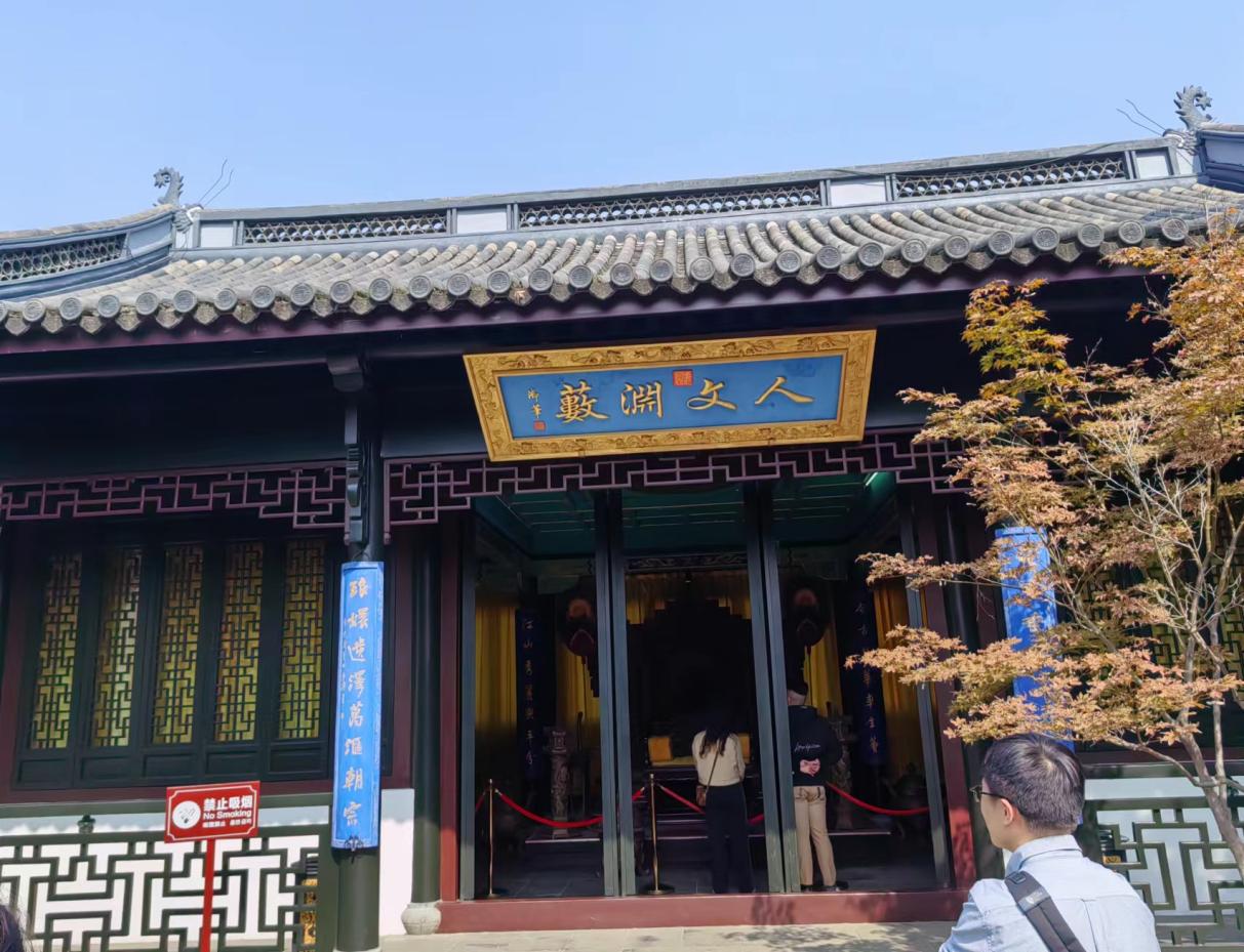 下山后,师生便一同前往了文宗阁。于老师说,这里曾藏有《四库全书》与《古今图书集成》,藏书非常丰富。清藏《四库全书》于南北七阁,镇江金山寺文宗阁与扬州大观堂文汇阁、杭州孤山圣因寺文澜阁并称“南三阁”,每阁均藏有一部抄本。后太平天国军由瓜州攻占镇江之战中火毁金山寺,使此处阁书俱焚。如今重建的文宗阁形制华美,但仅占其旧址,阁中器物均为后置,我们也难从吉光片羽中了解其曾经的繁盛了。