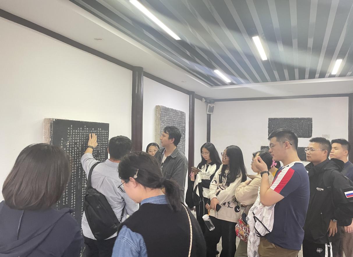 随后在于老师和薛老师的带领下,同学们沿着馆内展览路线对出土文物一一参观。我们重点参观了隋炀帝墓志。恰巧昨日参观焦山碑林时,有同学对墓志和墓志铭的基本概念提出了疑问,此时正好得到了现场解答。《隋炀帝墓志》右上部分因与志盖紧密贴合,石面保存较好,文字清晰,但其余部分剥蚀严重,石筋纵横,对志文的解读有较大影响。于老师和同学们就墓志拓本上第七行贞观纪年的“▢年”文字展开了讨论,重点分析了“元年”和“九年”两种解读各自的可行性。
