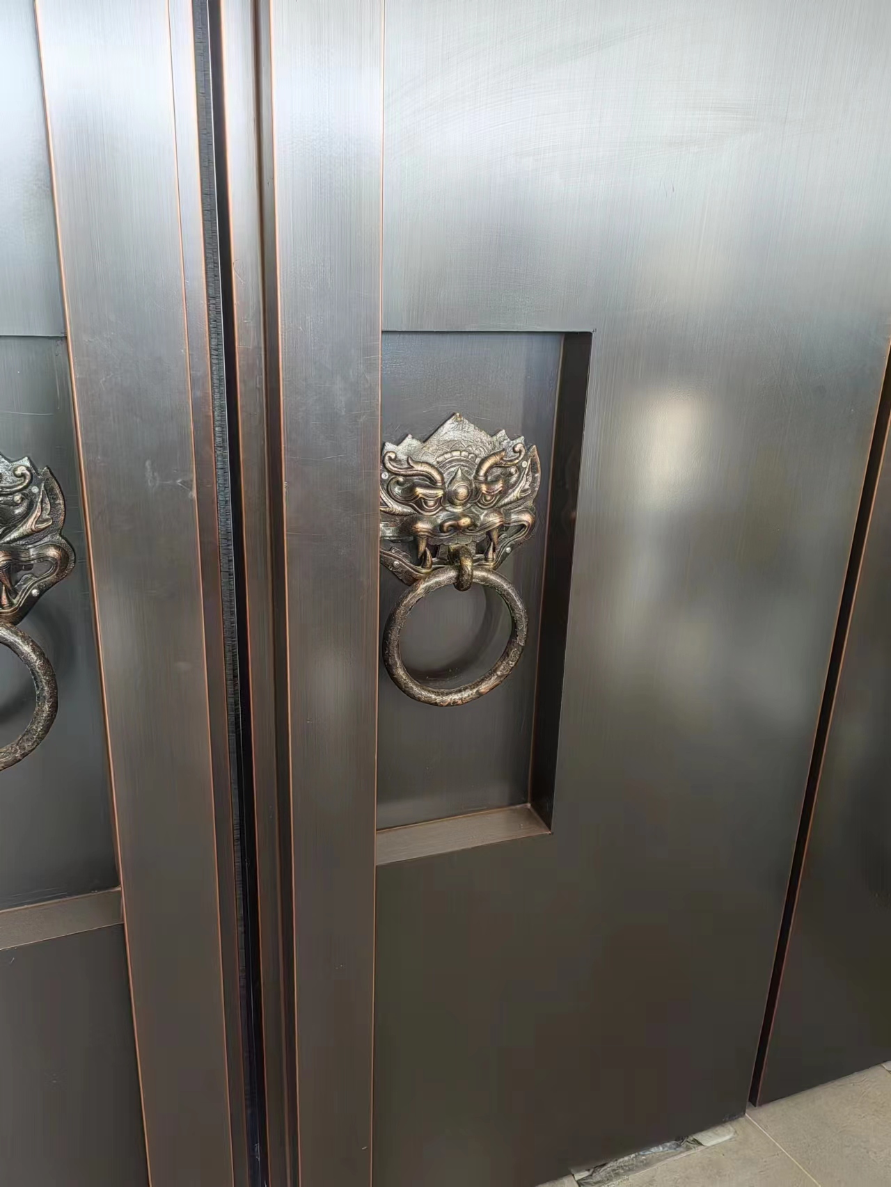 来到有着飞扬的弧形屋檐设计的展览馆前,细心的同学们注意到大门的门把手的形状有些奇特。据介绍,门把手正是以隋炀帝陵出土的文物——青铜鎏金铺首为原型而设计的。隋炀帝陵墓共出土四件青铜铺首,通体鎏金,与唐大明宫遗址出土的铜铺首大小相若,兽面直径26厘米。据考古专家推测,该铺首应该是棺木上的饰件,这种情况在魏晋南北朝时期的墓葬中并不鲜见。