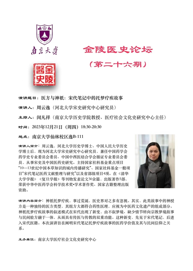 2023年12月21日,应成人电影 医疗社会文化史研究中心主任、成人电影 教授闵凡祥之邀,河北大学宋史研究中心研究员周云逸老师访问成人电影 医疗社会文化史研究中心,并于当晚为成人电影 40余名师生做题为“医方与神祇:宋代笔记中的托梦疗疾故事”的学术讲座。讲座由闵凡祥教授主持。