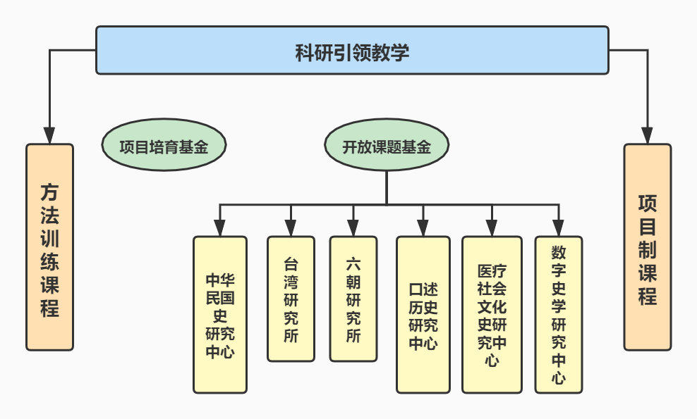 (三)强化科研训练。不断加强拔尖学生科研能力培养,坚持科研引领,设置“项目培育基金”(面向低年级学生)和“开放课题基金”(面向高年级学生),以志趣为导向、以追求卓越为核心,构建研究型教学课程体系,打造以“教学做合一”为特征的“项目制课程”,推动“知名教授领衔-课题全面开放-全程深度参与”为特征的科研能力系统培养机制,鼓励学生以各种方式加入学术导师的研究课题,在导师的指导下完成项目设计、课题展开、学术研究的全过程,在研究实践中掌握学术规范、先进的学术理念和方法,为将来的学术研究夯实基础。