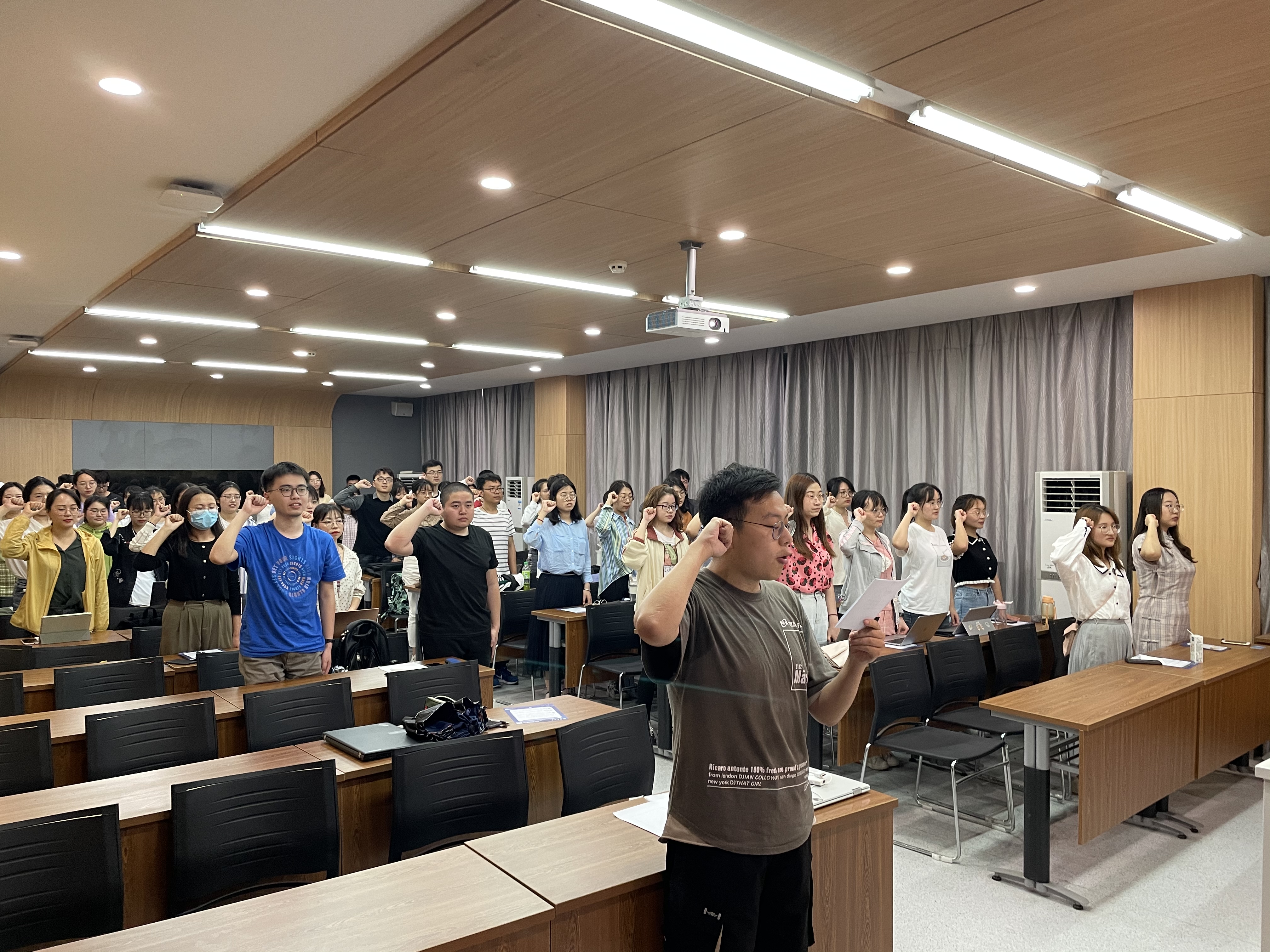 会议开始由团支部书记谈薇主持新团员入团仪式、老团员重温入团誓词。在团支部副书记常远的带领下,全体团员将右拳高举过肩,齐声宣誓,在神圣庄严的仪式感中凝聚共识,增强共青团员意识。