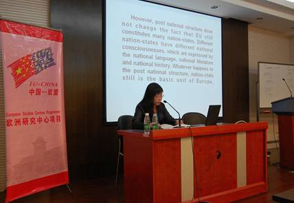 洪霞副教授发表演讲 最后发言的是历史系洪霞副教授,她的报告主题是“后民族时代的欧洲民族国家”(European Nation-States in the Post-national Era)。洪霞老师认为,虽然欧洲一体化的程度已经很深,欧洲仍然由许多民族国家组成,这一局面并没有被后民族时代所改变,民族国家仍然是欧洲的基本单位。哈贝马斯提出了公共领域(public sphere)的概念,在民族国家的建构中至关重要,欧洲层面上的公共领域能否产生还有待进一步考察。欧洲认同有两个方面,其一是多元,其二是同一,所谓 “求同存异”看似深奥,实际上揭示了欧洲文化认同的脆弱。与其将民族国家加以扬弃,不如进一步超越。 与会的除了发表讲话的专家,还有许多对欧盟研究深感兴趣的师生,他们在主题发言结束后与中海**家家进行了深入而又热烈的交流。(历史系李超供稿)