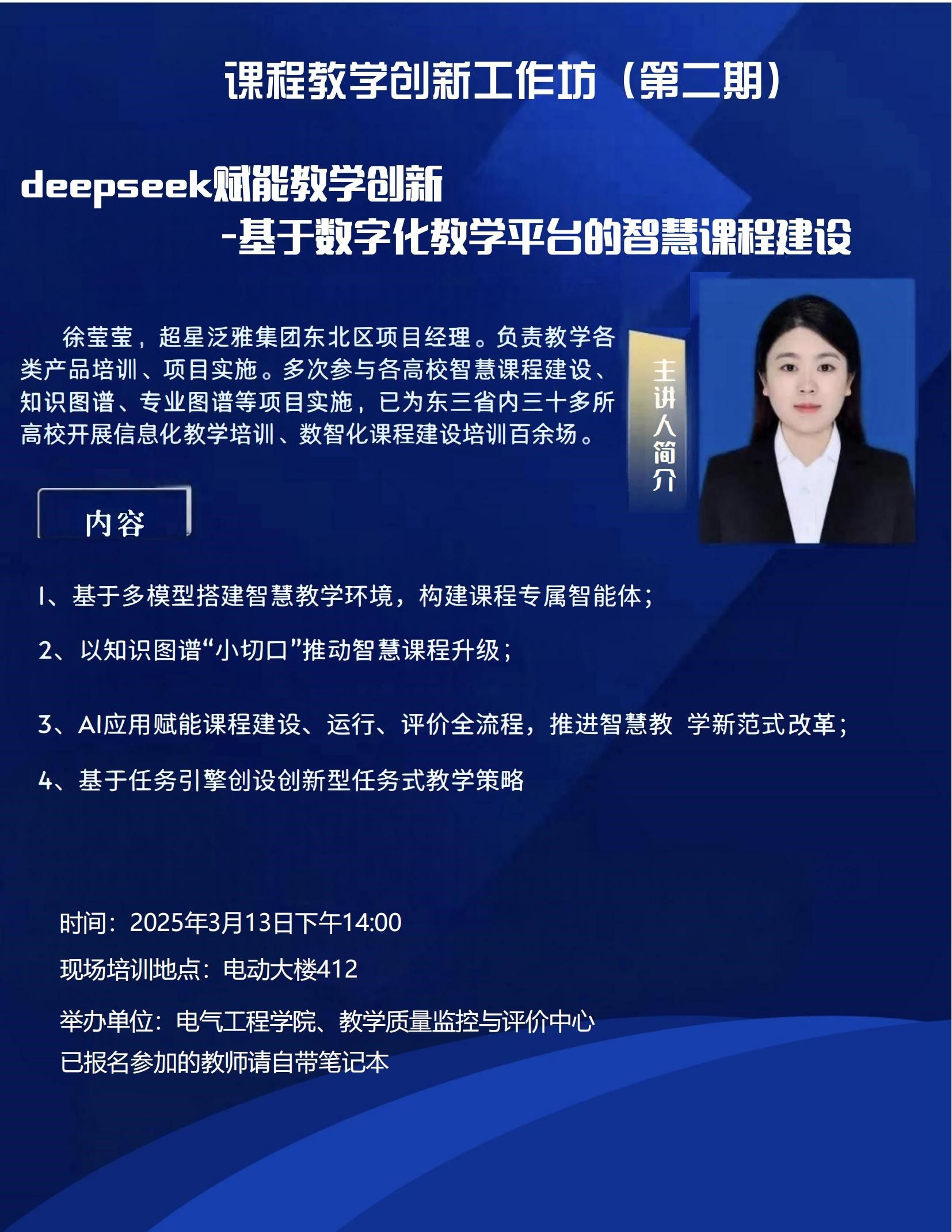 为了推动学校智慧课程建设工作的深入开展,充分利用包括DeepSeek在内的教育教学新技术提升人才培养的效率和质量,同时作为成人电影“课堂教学质量巩固提升年”工作内容的一部分,2025年3月13日下午2:00在电动大楼A412会议室,成人电影