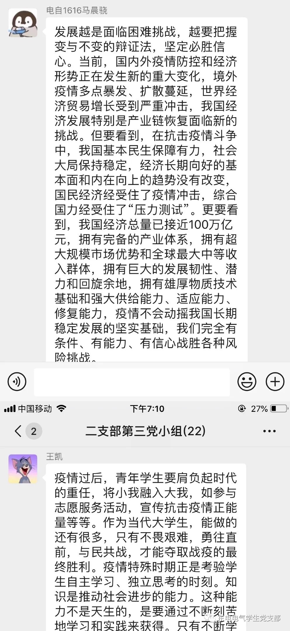 12个学生党支部开展“疫情中的思考”线上主题党日活动。