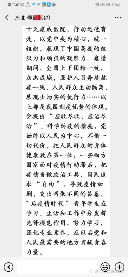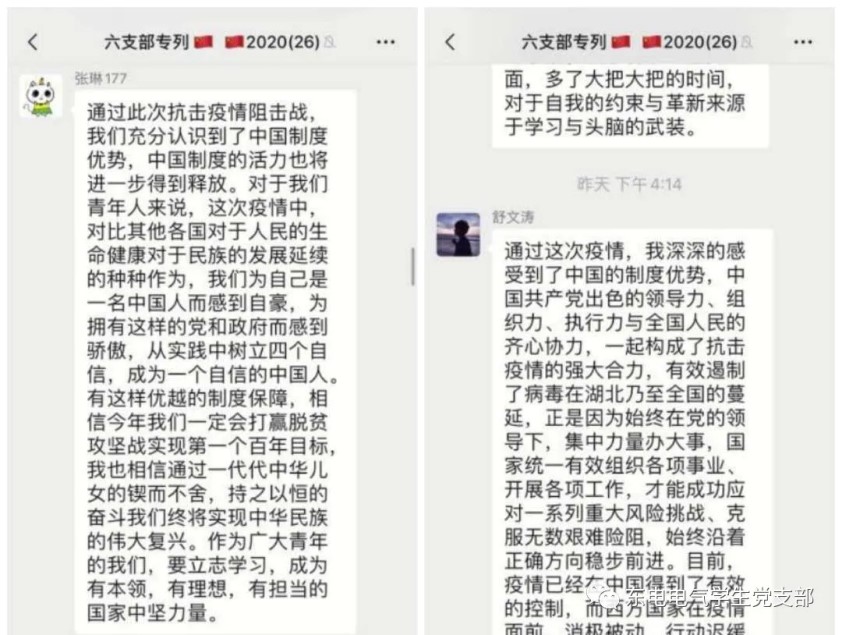 本次线上主题党日活动,加深了全体党员对中国特色社会主义制度优势的认识,进一步增强了“四个意识”,坚定了“四个自信”,坚决做到“两个维护”。同时,增强了学生党员的责任感和使命感。希望成人电影全体党员能够从自我做起,发挥先锋模范作用,共同助力打赢疫情防控阻击战!
