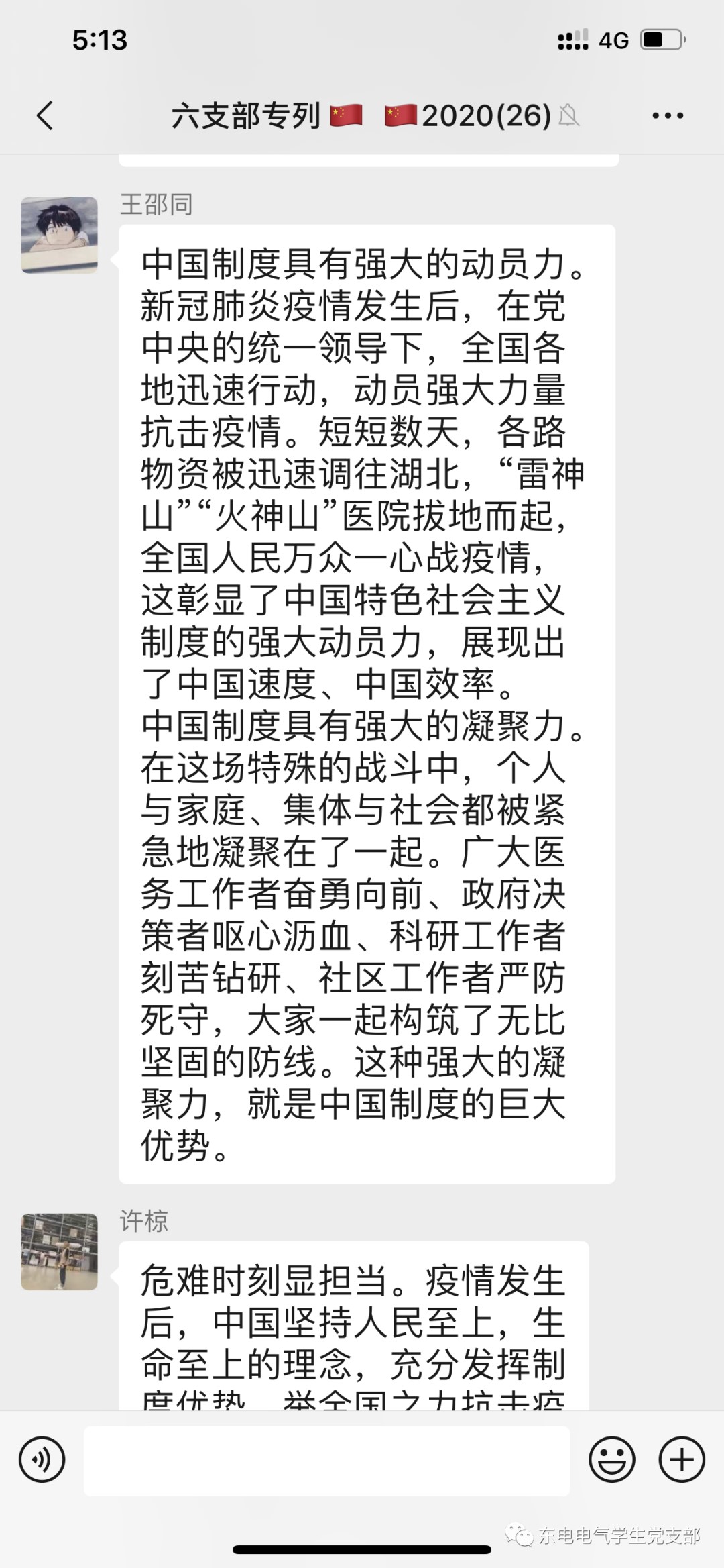 大家普遍认为,‘后疫情时代’世界形势新的变化,青年学生应树立大局意识,不传谣,不信谣,严格遵守国家和学校的防控要求,一切行动听指挥;勇于担当,积极作为,随时准备投身到学校开学各项志愿服务工作中去;珍惜时间,勤于学习,沉淀自己,调整身心状态,“为中华崛起而读书”绝不是过时的口号,中华民族伟大复兴的中国梦需要我们的聪明才智;坚定必胜信心,在党中央的坚强领导下,我们定会早日打赢疫情防控的人民战争、总体战、阻击战。