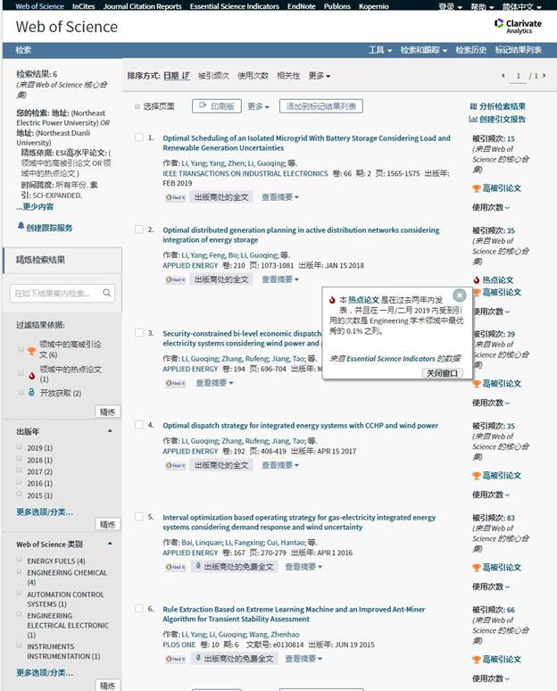 近日,根据2019年5月基本科学指标数据库(Essential Science Indicators,简称ESI)最新统计数据显示:李扬副教授、冯博硕士研究生、李国庆教授等于2018年1月在国际著名学术期刊《Applied Energy》发表的论文“Optimal distributed generation planning in active distribution networks considering integration of energy storage[J]. Applied Energy, 2018, 210: 1073-1081.”同时入选本期ESI热点论文(前0.1%)和ESI高被引论文(前1%)。这是我校首次以第一作者单位发表ESI热点论文,实现了我校在ESI热点论文零的突破。