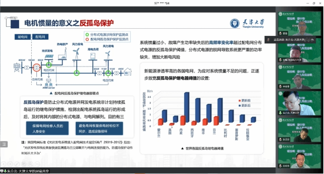 朱介北教授作了题为《电力电子化电力系统的自适应变惯量模拟控制》的报告,分享他在新型电力系统惯量模拟方面的最新研究成果;辛业春教授作了题为《交直流混合配电网规划及优化运行控制》的报告,从配电网发展需求、交直流配电网的规划以及交直流配电网的优化运行控制三方面进行了分享;姜懿郎博士作了题为《直流受端电网暂态电压稳定性和换相失败特性初探》的报告,讨论了感应电动机负荷与电网电压稳定性关系、直流受端连续换相失败机理两方面的初步探索结果及未来发展方向;吕项羽总工作了题为《吉林省新型电力系统建设的探索与实践》的报告,介绍了吉林省在新型电力系统建设过程中面临的挑战、行动方案以及关键技术;刘铖副教授作了题为《响应驱动的新型电力系统稳定判别及优化调控》的报告,分享了他在新型电力系统安全稳定分析与调控方面的最新研究成果。