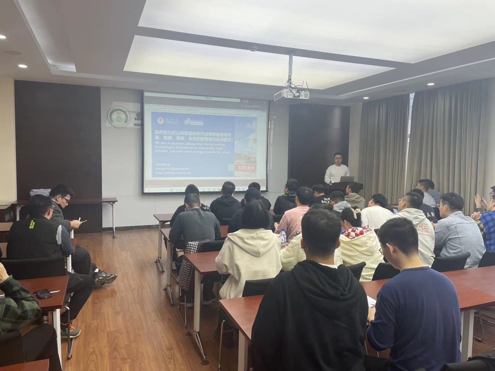 报告会上,惠红勋博士刨析了以高比例新能源接入和高比例电力电子设备应用为特征的“双高”新型电力系统面临的安全稳定运行新挑战;分析了温控负荷、商业楼宇、电动汽车、分布式储能等需求侧灵活资源的可调节潜力,基于此探究在不影响用户生产生活的前提下提升系统灵活性的调控技术;最后,介绍了澳门大学智慧城市物联网国家重点实验室的主要研究方向和代表性成果,阐述了实验室开展前沿基础理论与技术研究,推动清洁、高效、安全的智慧城市能源体系发展的愿景。